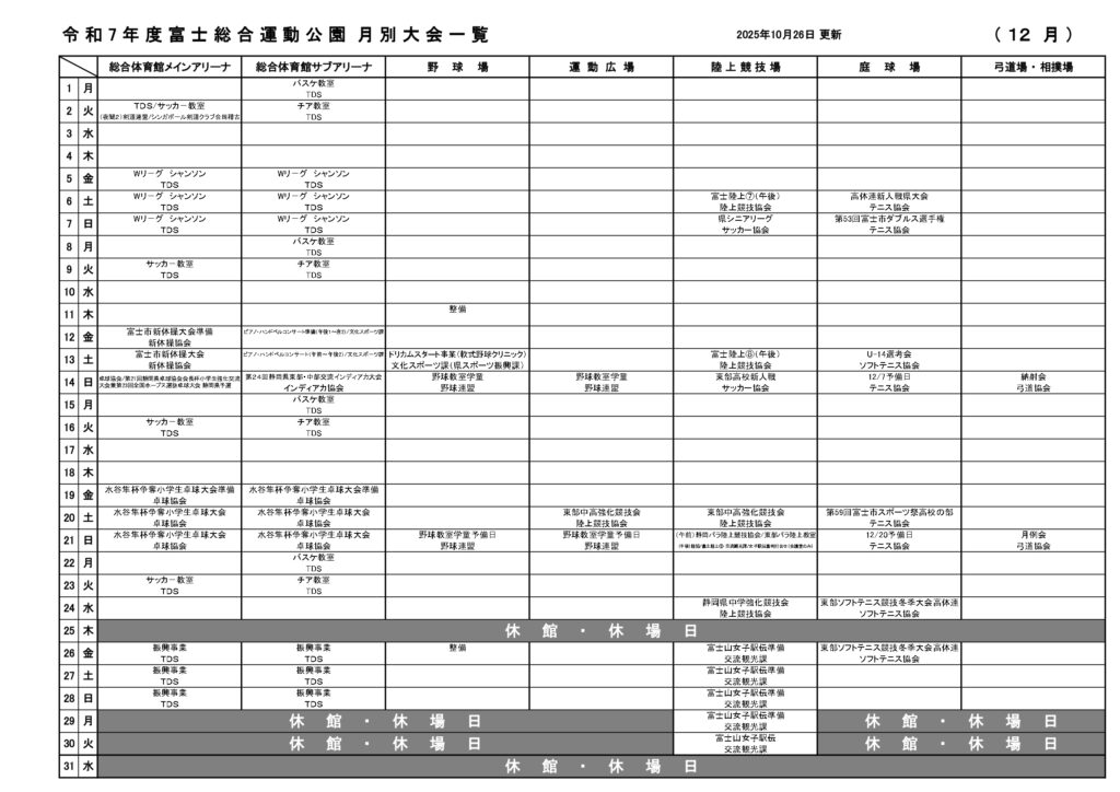 毎月第4木曜日(12月25日)は休館・休場日となります。